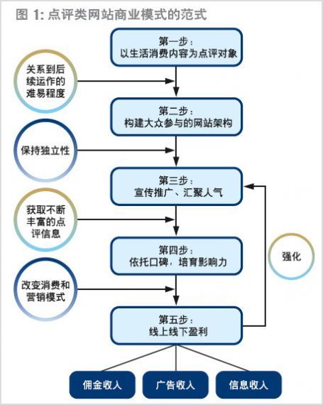 綜合對大眾點評網(wǎng)的剖析,可以發(fā)現(xiàn)點評類網(wǎng)站商業(yè)模式的范式,其經(jīng)營軌跡可以分為五個基本步驟(如圖):第一步,確立以生活消費內(nèi)容為點評對象,這直接關(guān)系到后續(xù)運作的難易程度;第二步,構(gòu)建大眾參與的網(wǎng)站架構(gòu),樹立獨立形象,為網(wǎng)站的低成本運作奠定基礎(chǔ);第三步,宣傳推廣,匯聚人氣,吸引用戶的點評,獲取不斷豐富的點評信息;第四步,網(wǎng)聚用戶點評,依托口碑的力量,通過改變消費和營銷模式,培育影響消費者和被點評對象所屬商戶的能力;第五步,線上線下盈利,并通過盈利,進一步加強網(wǎng)站的宣傳推廣,使其運作達到良性循環(huán)。