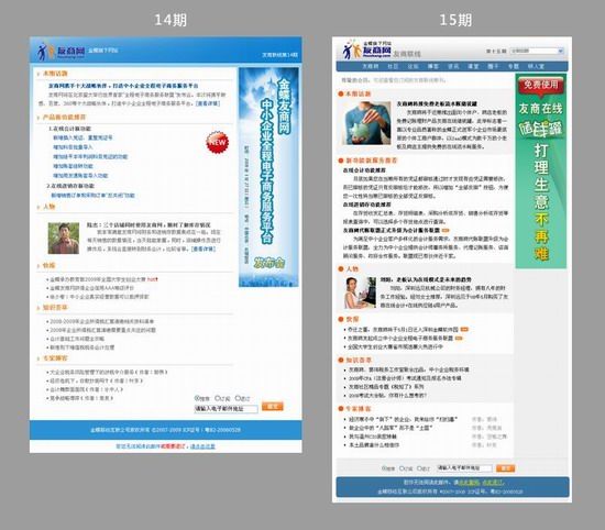 其實友商聯(lián)線15期和14期,在風格設計上是近似的,都是商務風格,簡潔大方,藍色調(diào)子,右邊為廣告區(qū)域。視覺設計并沒有新的改觀和體驗。