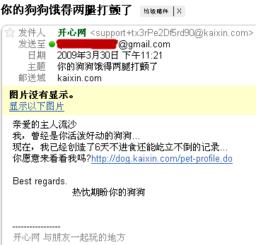應該是開心網(wǎng)(kaixin.com)的寵物功能又升級了,這幾次發(fā)來的郵件內(nèi)容不僅不能讓我開心,反而讓我覺得很惡心。