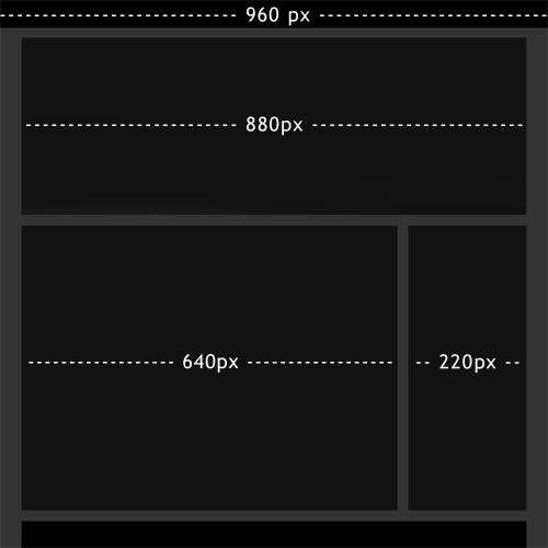 從上述簡(jiǎn)單的布局中,我們可以看到如何在css中規(guī)劃代碼。960px是我們的固定寬度,對(duì)于任何小于該尺寸的分辨率屏幕,我們將迫使水平滾動(dòng)條出現(xiàn)。所有內(nèi)容在一個(gè)880px的wrapper里,在左右兩側(cè)有40 px的margin,元素間有20px的間距。