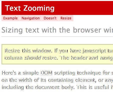 要看實(shí)際效果,可以到他的Text Zooming page. 頁(yè)。正如你所看到的那樣,腳本很好的退化,在較大分辨率屏幕上大文本容易閱讀,就像在小屏幕上小文本易于閱讀一樣。更重要的是,標(biāo)題和導(dǎo)航并不改變大小,所以元素可以決定那個(gè)元素應(yīng)當(dāng)使用文本縮放。