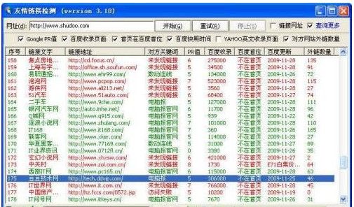 軟件操作非常簡單,運(yùn)行軟件后只需輸入自己網(wǎng)站的網(wǎng)址,點(diǎn)擊“開始”后便自動開始檢測。軟件自動檢測對方網(wǎng)站的收錄、PR值等信息。如果嫌軟件太麻煩,還可以登錄http://link.chinaz.com,進(jìn)行在線檢測。