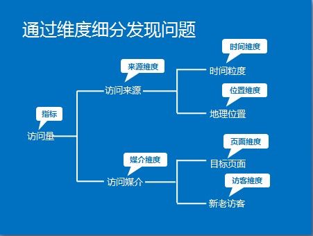 什么是細(xì)分呢?細(xì)分是在流量分析時最常用的方法。通常也是最有效的方法。細(xì)分是指通過不同維度對指標(biāo)進(jìn)行分割。查看同一個指標(biāo)在不同維度下的表現(xiàn)。進(jìn)而找出有問題的那部分指標(biāo)。對這部分指標(biāo)進(jìn)行優(yōu)化。這是一個流量細(xì)分的示意圖。指標(biāo)是訪問量,就是我們常說的流量。通過在來源維度,媒介維度,時間維度,位置維度等維度下我們可以對訪問量進(jìn)行單獨(dú)或者重疊的多維度細(xì)分。