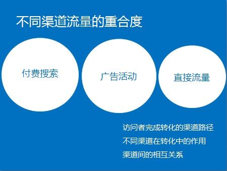 還記得前面的象限圖嗎,那里我們留下了一個問題,第三象限質(zhì)較低的流量如何處理,是否可以直接砍掉。答案是不能。為什么呢?因?yàn)樵L問者在整個的購買過程中會穿梭于多個不同的流量渠道中,他們使用不同的工具對信息和商品進(jìn)行查詢,對比并作出決策。并且越是價值高的商品,訪問者需求的信息越多,決策時間越長。而每個渠道在訪問者的轉(zhuǎn)化的過程中也會扮演不一樣的角色。有些渠道吸引注意,樹立品牌形象。例如門戶的banner廣告,有些提供精準(zhǔn)信息,例如搜索引擎廣告。而有些幫助訪問者進(jìn)行決策,比如比價和評論。因此,我們在處理前面的問題時,對于質(zhì)比較差的第三象限流量渠道需要分析這個渠道與其他渠道間的關(guān)系,也就是渠道間的重合度。以及這個渠道在整個轉(zhuǎn)化過程中扮演的角色。這里我們可以看到,廣告活動,付費(fèi)搜索和直接流量間有明顯的重合。直接砍掉廣告活動流量,或者降低廣告投放都有可能會影響另外兩個渠道的表現(xiàn)。