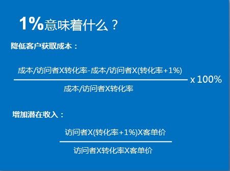 現(xiàn)在讓我們再來看一下1%對于網(wǎng)站來說到底意味著什么?轉(zhuǎn)化率的提高意味著購買流量的錢變的更有效,每個客戶的獲取成本更低。同時,新增的客戶產(chǎn)生了更多的訂單,進(jìn)而創(chuàng)造了更多的收入。并且轉(zhuǎn)化率提升1%對于網(wǎng)站來說是一個長期的,穩(wěn)定的,并且可以不斷累加的效果。