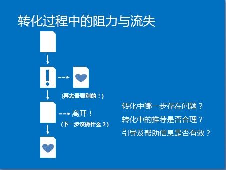 最后,我們來看下轉(zhuǎn)化分析。轉(zhuǎn)化渠道與前面的頁面導(dǎo)航很像,區(qū)別在于轉(zhuǎn)化渠道通常是一個目標(biāo)非常明確的封閉渠道。在這個渠道中我們希望訪問者一路向前,不要回頭也不要離開,直到完成轉(zhuǎn)化目標(biāo)。對于轉(zhuǎn)化渠道,我們主要進(jìn)行兩部分的分析,分別是訪問者的流失和迷失。下面先來看第一部分:轉(zhuǎn)化過程中的阻力的流失。轉(zhuǎn)化的阻力是造成訪問者流失的主要原因之一。這里的阻力包括錯誤的設(shè)計(jì)和錯誤的引導(dǎo)。